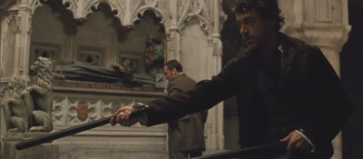 Ale Watsone, vy zapomínáte, že jsem přeborník v zápasu baritsu! Ano, Holmesovo vychloubání je černé na bílém zaznamenáno v řadě povídek, takže to všechno můžete shrnout tak, že Holmes umí brilantně střílet (i když po revolveru sahal výhradně Watson a to prosím pouze 7x!), má za sebou krátkou, leč velmi úspěšnou boxerskou kariéru, zvládá šermovat mečem, jezdeckým bičíkem a dřevěnými holemi. To že to ve svých vzpomínkách vždy velkoryse přeskočil, Ritchieho vůbec nerozházelo. "Všechny tyhle souboje jsme do filmu dali," hrdě se chlubí režisér. Z obrázků je patrné, že nepřeháněl. Nebo naopak přeháněl až moc. Jsou každopádně dva typy útoků, které zbrzdí i hyperaktivního Holmese.