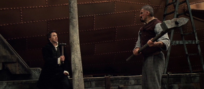 A) Každý ví, že na velikosti záleží. V tomhle případě jde jak o svaly, tak o nástroj, jenž svírají. Scénka s kladivy je asi nejvýraznější částí ukázky a všem se vryje do paměti. Bohužel spíš tím, že působí jako groteska od Disneyho uprostřed jakž takž seriózní detektivky. Nechci do toho znovu rýpat, ale od Ritchieho opravdu nemůžeme čekat byť jen trochu vážně míněného Holmese. Kladívkování naznačuje mnohé a akční scény, jakkoliv zručně nasnímané, atmosféru detektivky nepodrží. Spíše naopak.