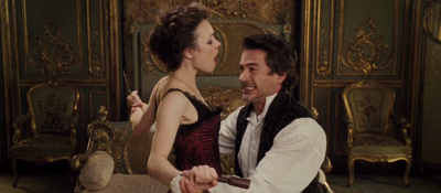 B) Koleno v rozkroku je chvat, jehož krytí mistři bojových umění trestuhodně zanedbávají. A takhle to pak dopadá. Ke cti Rachel McAdams je třeba dodat, že ztvárnila Irenu Adlerovou, Holmesovu femme fatale a jedinou ženu, která ho dokázala upoutat jak po stránce fyzické, tak intelektuální. Stalo se tak v příběhu Skandál v Čechách. Snímek by se měl odehrávat poté. Irena je jednou z osob, která by Holmese měla žádat o pomoc. V téhle scéně to však vypadá, že pomoc bude potřebovat někdo jiný. Obsazení Rachel McAdams doporučil Downey Jr., i když Ritchie namítal, že na Holmesův milostný objekt je příliš mladá. Rachel je třicet, ale ze záběru byste klidně hádali, že by mohla být Downeyho/Holmesovou dcerou.