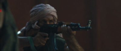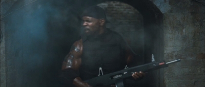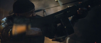 A pak tu máme zavalitého černocha Terryho Crewse. Nevím, jestli Stallone žárlil na mohutného raubíře Heavy Duty z G. I. Joe a chtěl pro svého afroamerického hromotluka ještě větší bouchačky, každopádně právě u něj začíná slušné defilé použitých ráží a typů.