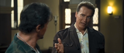 Mimické svaly Terminátorovi malinko povolily, hrudní koš už nehalí takový krunýř svalů, ale hláškování Arniemu pořád jde. Zvlášť ve štýrskohradeckém dialektu, který ani dlouhá politická kariéry příliš neobrousila... Když Arnold oglosoval Slyovu zálibu v zabíjení lidí v džungli, mohli jsme se letmo dotknout dlouho vyhlížené scény se svatou akční trojicí přelomu osmdesátých a devadesátých let.