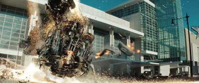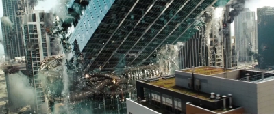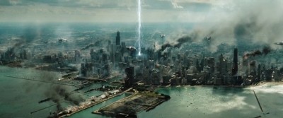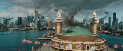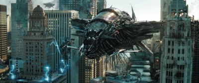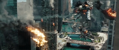 V Chicagu nastane pořádná mela. Na záběru, který vizuálně připomíná nízkorozpočtový průser Skyline (aspoň vidíte, jaký potenciál bratři Strauseové promrhali – mimochodem červnová kinopremiéra v ČR stále platí), už jsou vidět zaparkované lodě Deceptikonů a výhled na město připomínající útoky z 11. září. Ještě že nevidíme zdevastovaný New York – to by vztek traumatizovaných amerických vlastenců nezastavila ani zpráva o smrti bin Ládina a dočkali bychom se protestů.