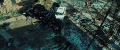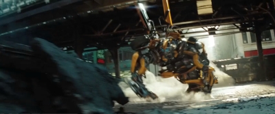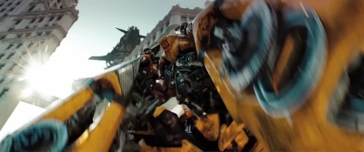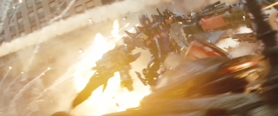 Tamtéž je i delší (a trikově ne tak vypilovaný) záběr na „bruslícího“ Optima Primea v maximálním nasazení. Přiletí díky jetpacku a plné rychlosti se vrhne do vřavy mezi Bumblebeeho, Mudflapa (vlevo dole) a další autobotí parťáky, kteří čelí deceptikonské přesile.