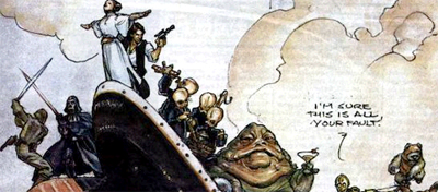 Existuje taková sympatická tradice, se kterou přišli Steven Spielberg a George Lucas. Když Star Wars vydělaly v kinech víc než Čelisti, Lucas si koupil v časopise Variety jednostránkovou reklamu, na niž R2D2 lovil žraloka. Spielbergův E.T. potom v tom samém časopise přebíral korunu od prťavého robota z Hvězdných válek, ale vrátil mu ji, když se v roce 1997 Star Wars znovu objevily v kinech. Ale o rok později připlul Titanic. A George Lucas se rozhodl Cameronovi pogratulovat k obřím tržbám opět s pomocí časopisu Variety. A měl styl.