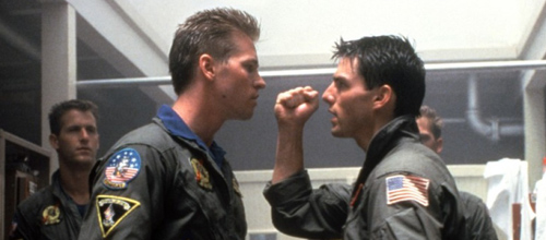 Můžeš bejt můj wingman... svět nezná lepší happyend. Kdyby neexistovala poslední dialogová linka Casablanky, klidně bychom mohli Top Gun vyhlásit jako tu úplně první bromanci. A přitom si šli kluci už od začátku pěkně po krku, v učebně, v letové hladině i na volejbalovém kurtu. Chladnokrevný a odtažitý Iceman (Val Kilmer) a splašený, nezodpovědný Maverick (Tom Cruise). Ano, v osmdesátých letech nám to musel Tony Scott naservírovat už ve volacích znacích, aby to ti pomalejší v kině pochopili. I divočák Cruise ovšem dostal od života sodu, pochlapil se a ustřelil frčky několika nepřátelským Migům, což vyústilo v krásné přátelství, jež se pohříchu nikdy nedočkalo filmového pokračování. Některé věci je ale lepší nepitvat. Znáte ono pohádkovské "happily ever after". Přesně takhle to Top Gunu sluší nejvíc. Tím spíš, že Kelly McGillis i Val Kilmer bohužel od genetického guru nedostali stejné karty jako Tom Cruise a těch necelých třicet let po premiéře jedničky už jaksi nesplňují přísná měřítka blockbusterové fotogeniky. U dvojky se samozřejmě dlouho spekulovalo o nové generaci, kterou by Maverick z pozice instruktora šéfoval, aby tak ochutnal Viperovu polívčičku. Už se asi nedočkáme a následovníci furt nikde (Stealth byl opravdu slabým odvarem). Kdo chce víc Top Gunu, ten si musí pustit Železného orla. A myslím to doslova, protože v téhle sérii byly některé ze záběrů v Top Gunu bez okolků použity znovu.