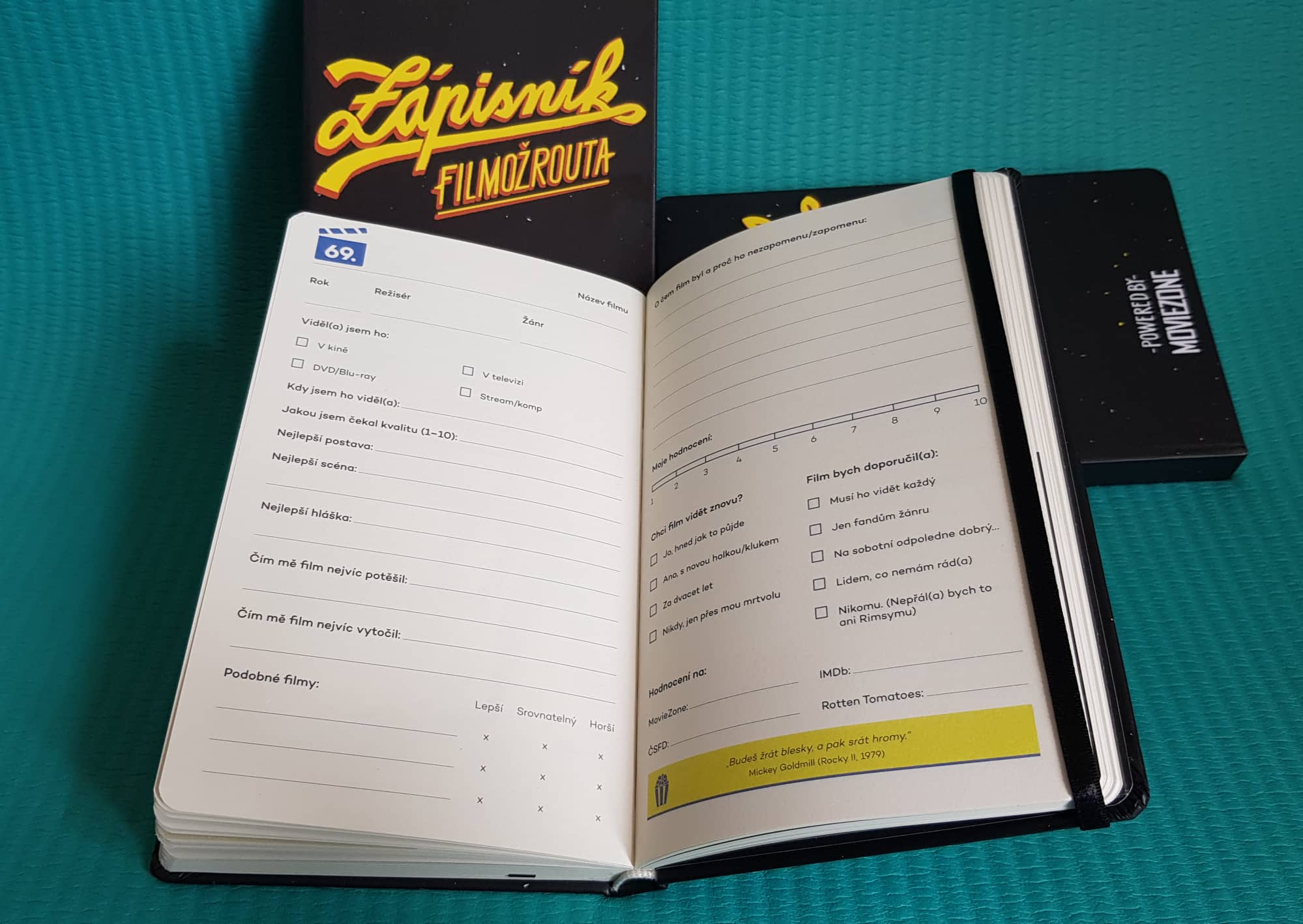 MovieZone byla řadu let jen webovým útočištěm pro všechny, kdo mají rádi filmy a chtějí si o nich rozumně pokecat. Před pár lety se ale Cival rozhodl, že bychom se měli scházet i přímo v kině, a tak vznikly Popkulturní milníky (v pátek 20. září bude Rambo 2!). Právě v Aeru jste nás často uháněli s tím, že by náš merch neměl skončit u triček a hrníčků. A i když nám ještě zdaleka nedošly nápady, všechny je předběhlo vydavatelství Presco, jež nás oslovilo s návrhem na filmový zápisník.
